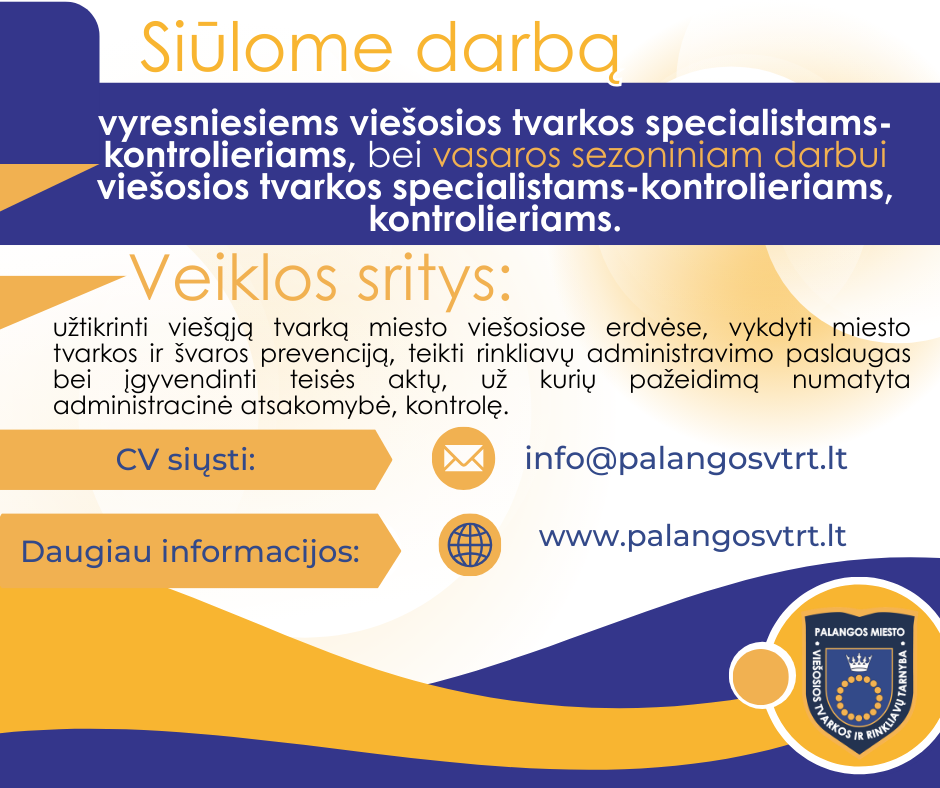 BĮ Palangos miesto viešosios tvarkos ir rinkliavų tarnyba stiprina komandą ir ieško trijų naujų darbuotojų dirbti vyresniaisiais viešosios tvarkos specialistais-kontrolieriais bei siūlo sezoninį darbą viešosios tvarkos specialistams-kontrolieriams ir kontrolieriams.
