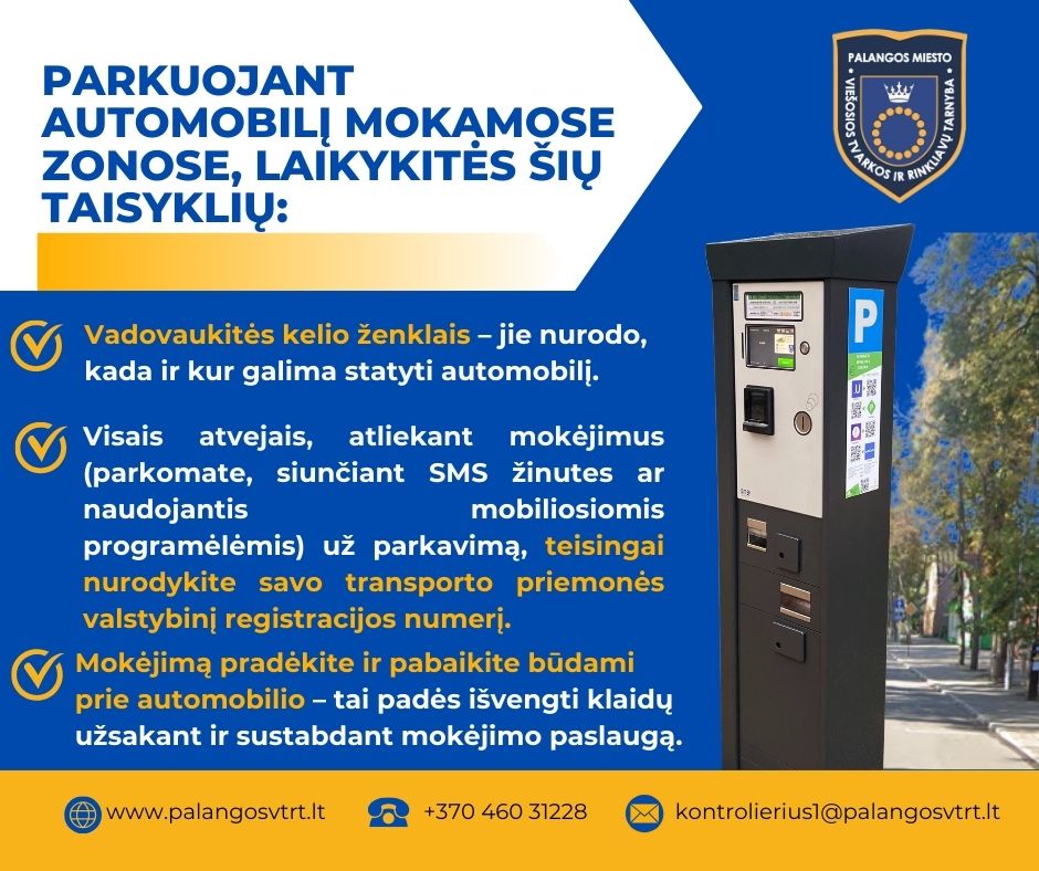 Būkite dėmesingi – stebėkite kelio ženklus, kurie nurodo, ar stovėjimo vieta yra mokama ir kada taikoma rinkliava. Tinkamai planuokite savo keliones ir laikykitės nustatytų taisyklių.